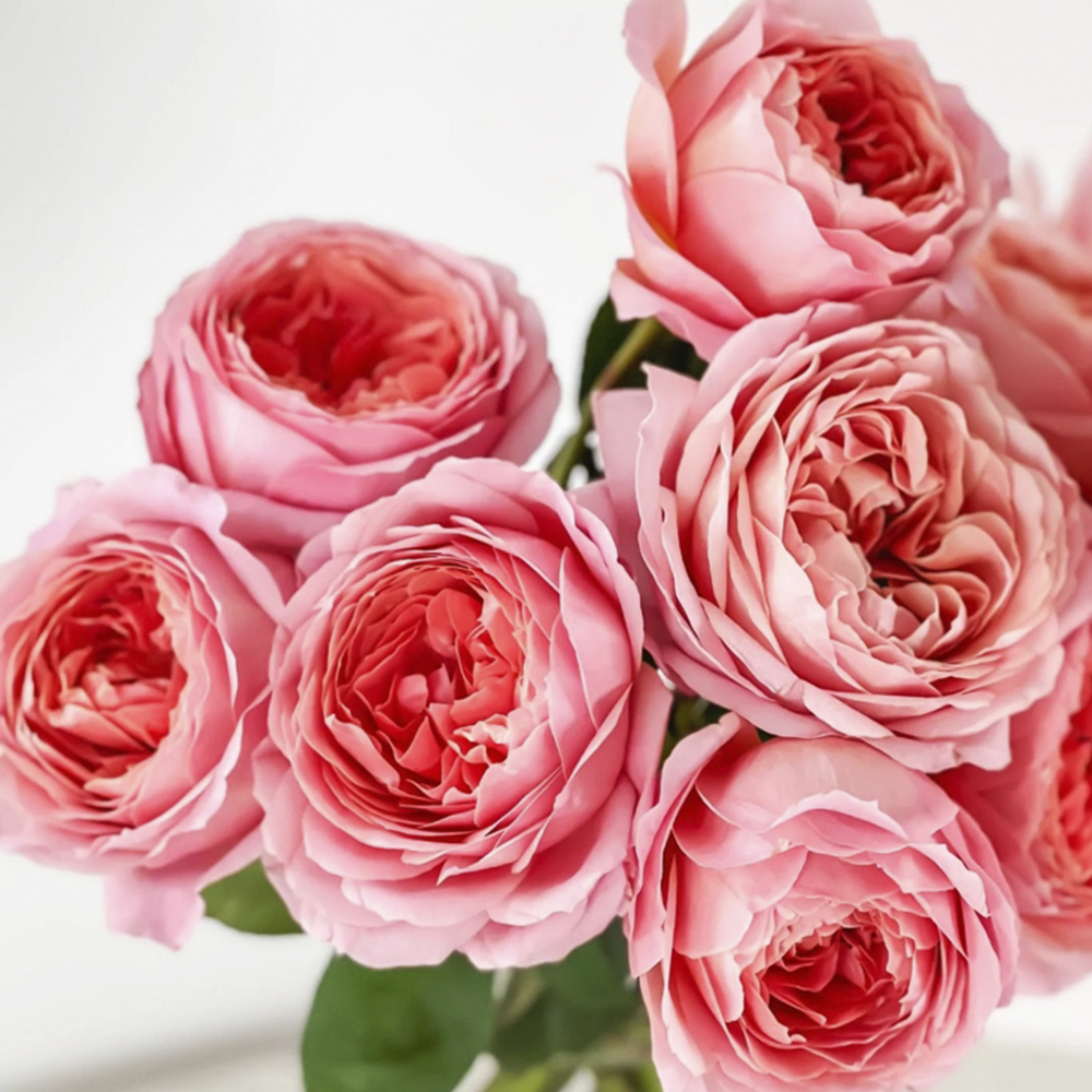 Квіти англійської піоноподібної троянди Романтик Антик: великі, до 12 см у діаметрі, рожевого кольору з кораловим відтінком, густомахрові, на одному стеблі може бути до 3 квіток, бутон округлої форми.
