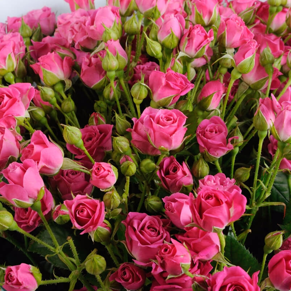 Квіти бордюрної троянди Лавлі Лідія: невеликі, махрові, зібрані у суцвіття по 3-5 квіток на стеблі, яскраво-рожеві, без сильного аромату.