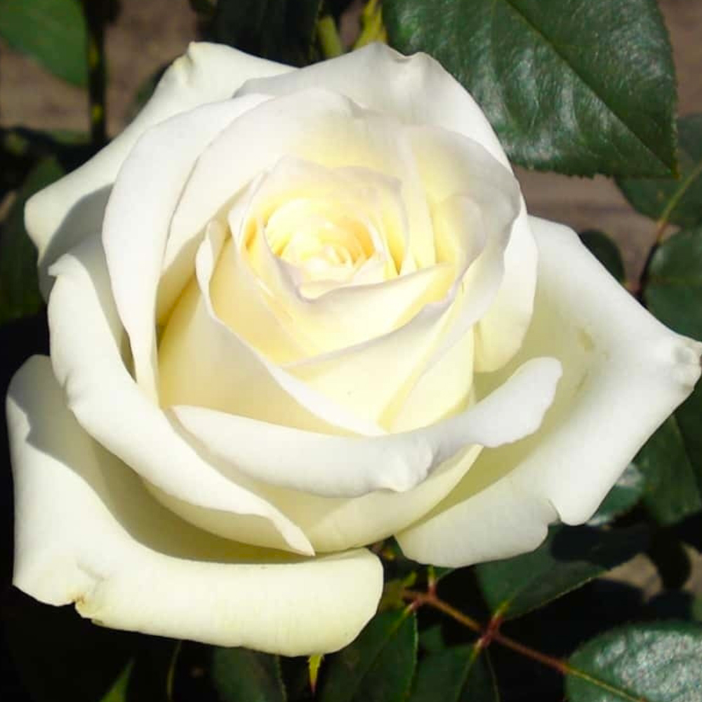 Основна особливість чайно-гібридної троянди Анастасія: великі білі квіти, які стійкі до дощу та сонячних променів, зберігають форму та яскравість тривалий час.
