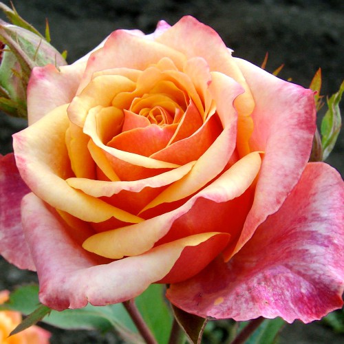 Основна особливість чайно-гібридної троянди Черрі Бренді: яскраве багатошарове забарвлення пелюсток із відтінками персика та рожевого, яке привертає увагу в будь-якому саду.