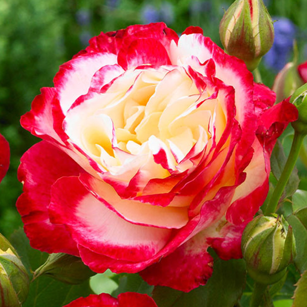 Чайно-гібридна троянда Дабл Делайт — сорт, який вражає своїми контрастними, яскравими пелюстками. Бутон розкривається в пишну квітку, яка змінює колір від кремово-білого до насиченого червоного на краях, особливо під впливом сонця. Квіти мають чудовий аромат, що робить цей сорт одним із найбільш запашних.
