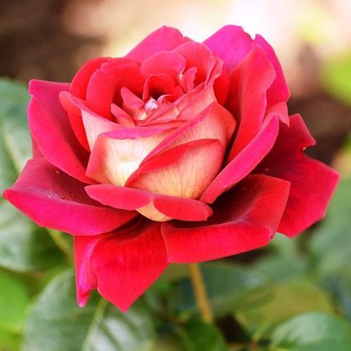 Основна особливість чайно-гібридної троянди Кроненбург: унікальне поєднання вишнево-червоних і жовтих пелюсток, що додає яскравого контрасту.