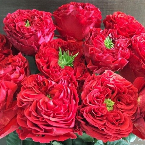 Квіти чайно-гібридної троянди Ред Айс: квіти великі, махрові, формують класичні чашоподібні бутони діаметром 10-12 см. Аромат легкий, квіти можуть з’являтися як поодиноко, так і в невеликих суцвіттях. Забарвлення насичено-червоне, з яскраво-зеленою серцевиною.