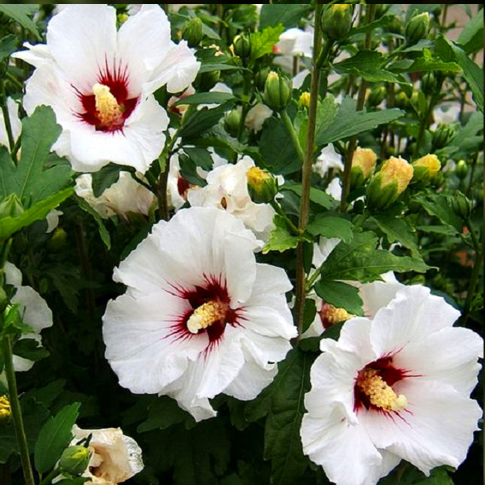 Квіти гібіскусу Сирійський Білий: великі, до 10 см у діаметрі, білого кольору, з легким ароматом, формують компактні суцвіття.