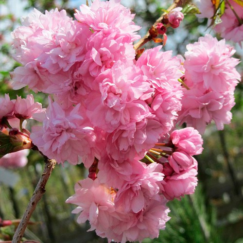 Квіти сакури на штамбі Кіку-Шідаре: великі, махрові, рожевого кольору, діаметром 4-5 см, з приємним ароматом, суцвіття густі.