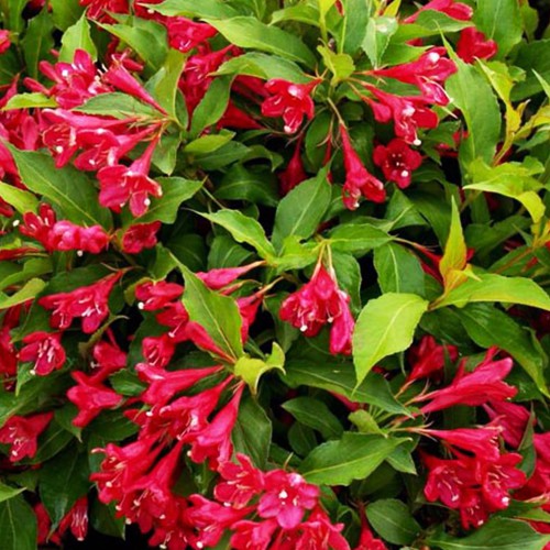 Вейгела Червона — сорт, що приваблює насиченими темно-червоними квітами, які густо вкривають кущ у період цвітіння. Цей сорт ідеальний для додання кольору вашому саду. Легкий у догляді, він підходить для різних умов зростання і чудово виглядає в ландшафтних композиціях.