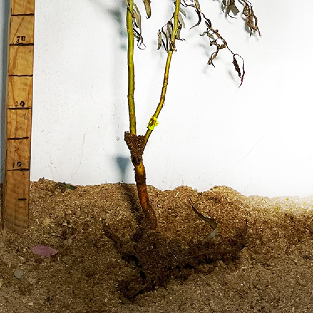Процес упаковки: Коріння саджанців обробляються спеціально приготованим розчином, так званою "бовтанкою", потім посипаються вологою тирсою і обмотуються стрейч-плівкою.