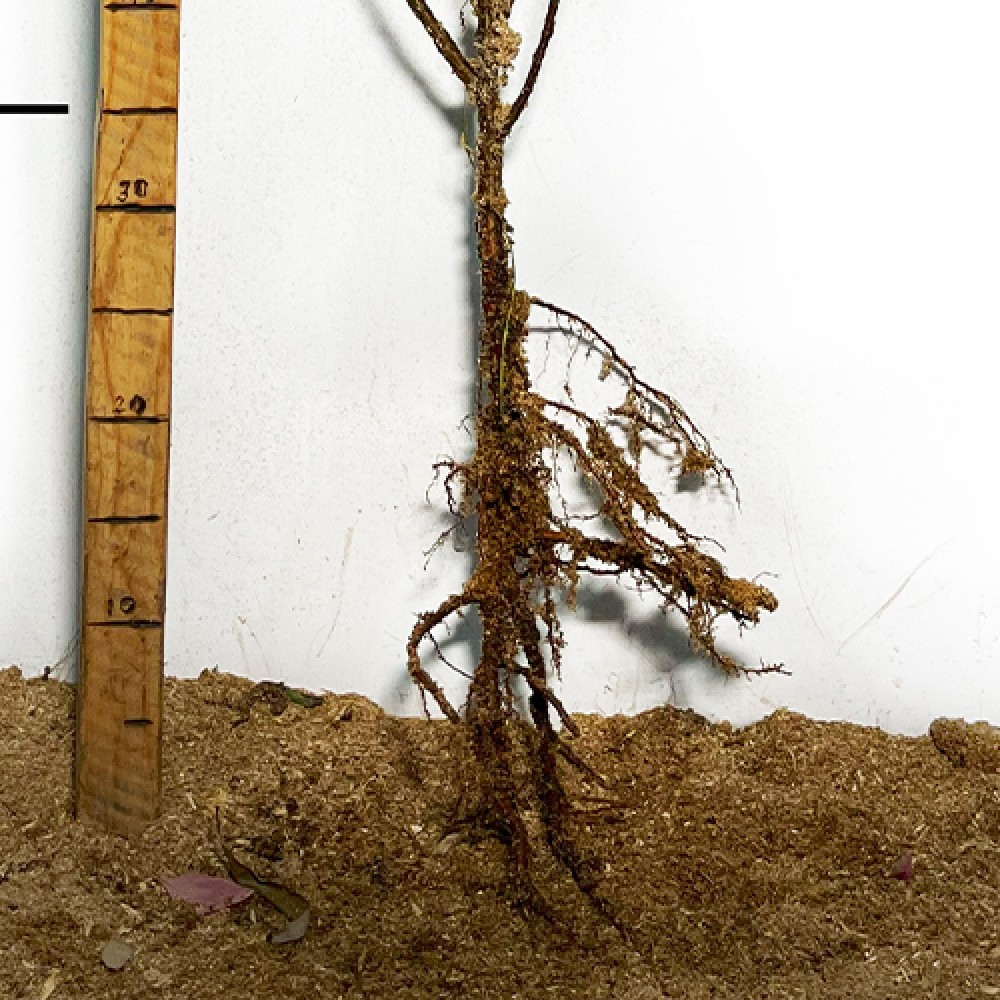 Процес упаковки: Коріння саджанців обробляються спеціально приготованим розчином, так званою "бовтанкою", потім посипаються вологою тирсою і обмотуються стрейч – плівкою.